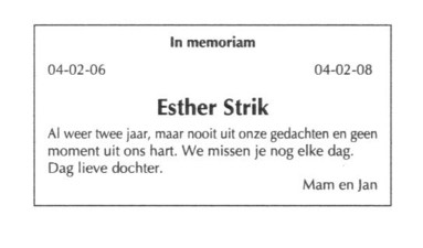 Ik ben heel blij dat ik Esther als mijn nicht heb mogen hebben n zonder het groter te maken dan dat het is, ik vond haar echt een moordwijf. Als Esther iets vond was het oke in mijn ogen. Dat ik haar dan nu naar alle waarschijnlijkheid in ga halen, vind ik ondragelijk. Belachelijk. Zij was altijd net een stap verder. Ik hield van haar, nee ik hou nog steeds van haar, dat gevoel zal altijd blijven en ik ben heel blij, dat ik haar dat nog uit de grond van mijn hart heb kunnen zeggen. En zij mij ook, in haar laatste smsje op 29 januari 2006:
