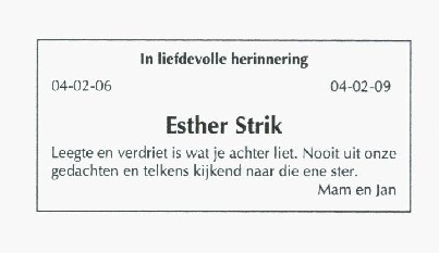 Tja Es, we zijn alweer een jaar verder en ik denk veel aan je. Jouw overlijden heeft mij ook wel gesterkt in mijn visie op het leven, dat je de dingen die je wilt doen niet te lang moet uitstellen, je kan morgen wel dood zijn. Ik leef mijn leven niet alsof elke dag mijn laatste kan zijn maar ben me wel erg bewust van de eindigheid van het leven en het belang de dingen te doen waar je goed in bent en wat je belangrijk vind.